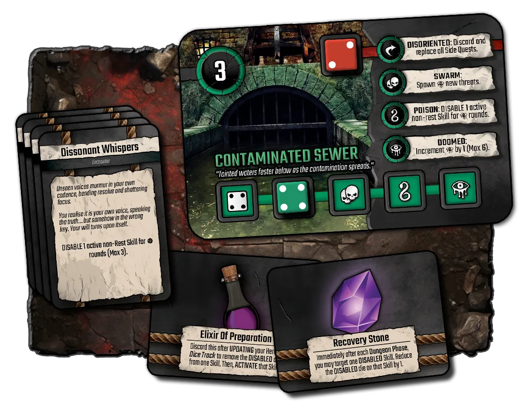 The depths of the underground evolve ever darker… From new Encounters to an entirely new Dungeon card, the enhanced DISABLE feature is now implemented throughout.